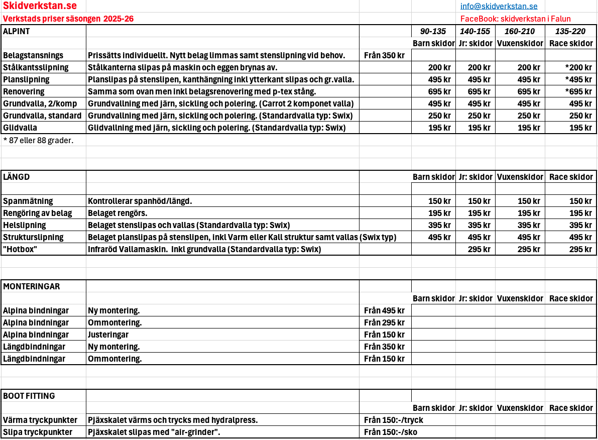 Skidverkstan i Falun är en verkstad som reparerar det mesta, slipar, vallar och monterar och om-monterar alpina utrustning samt längd utrustningar, gammalt som nytt, stort som litet och långt som kort.